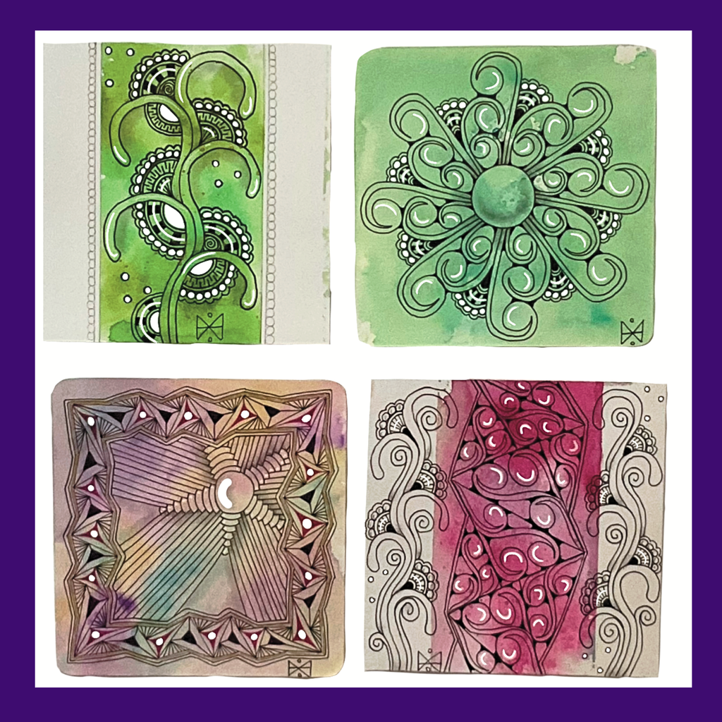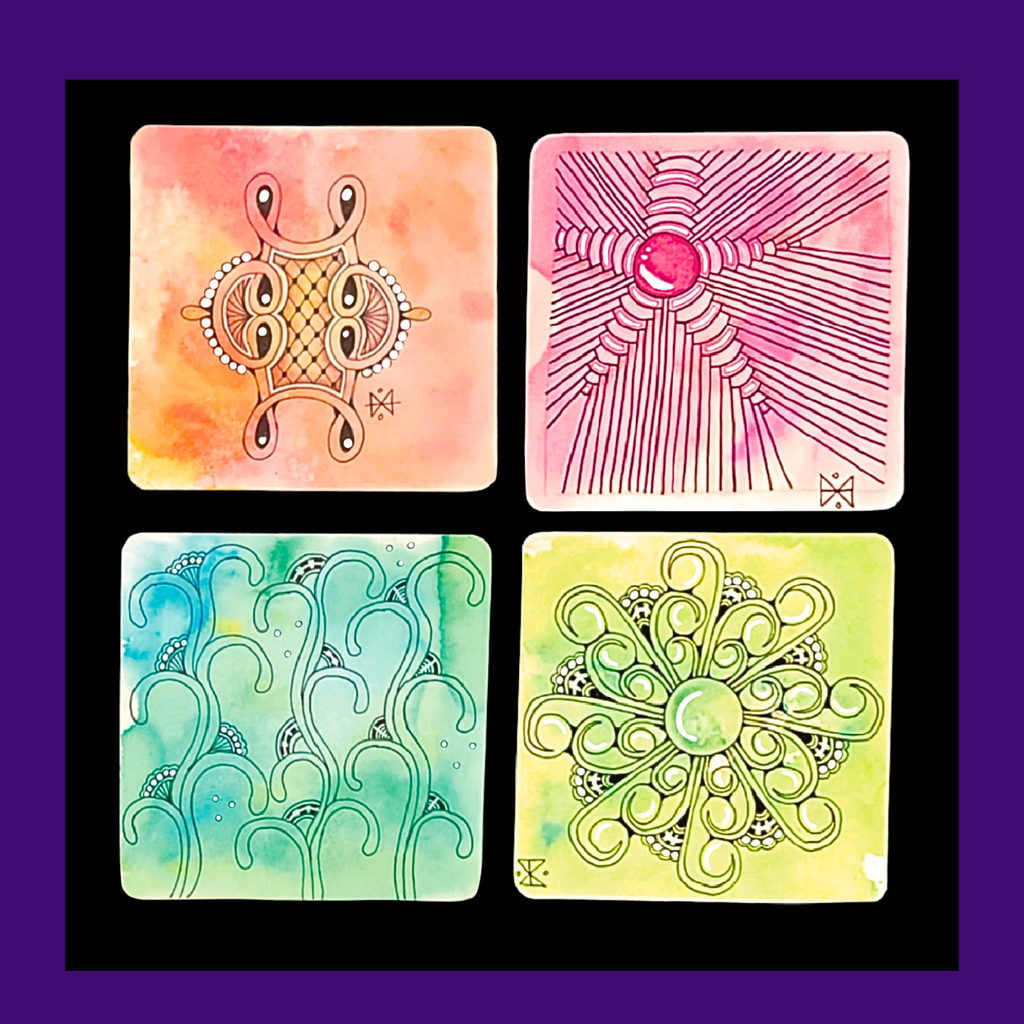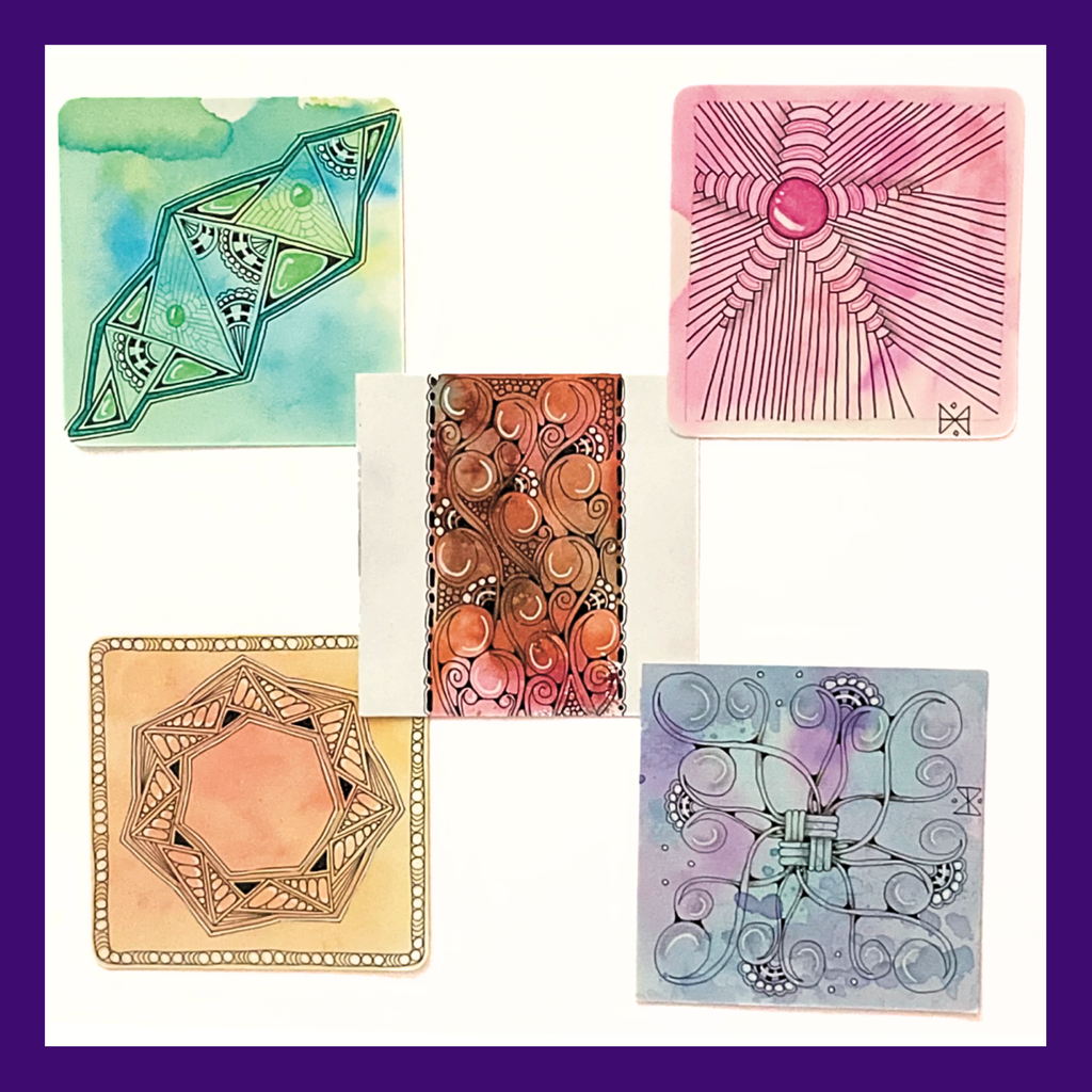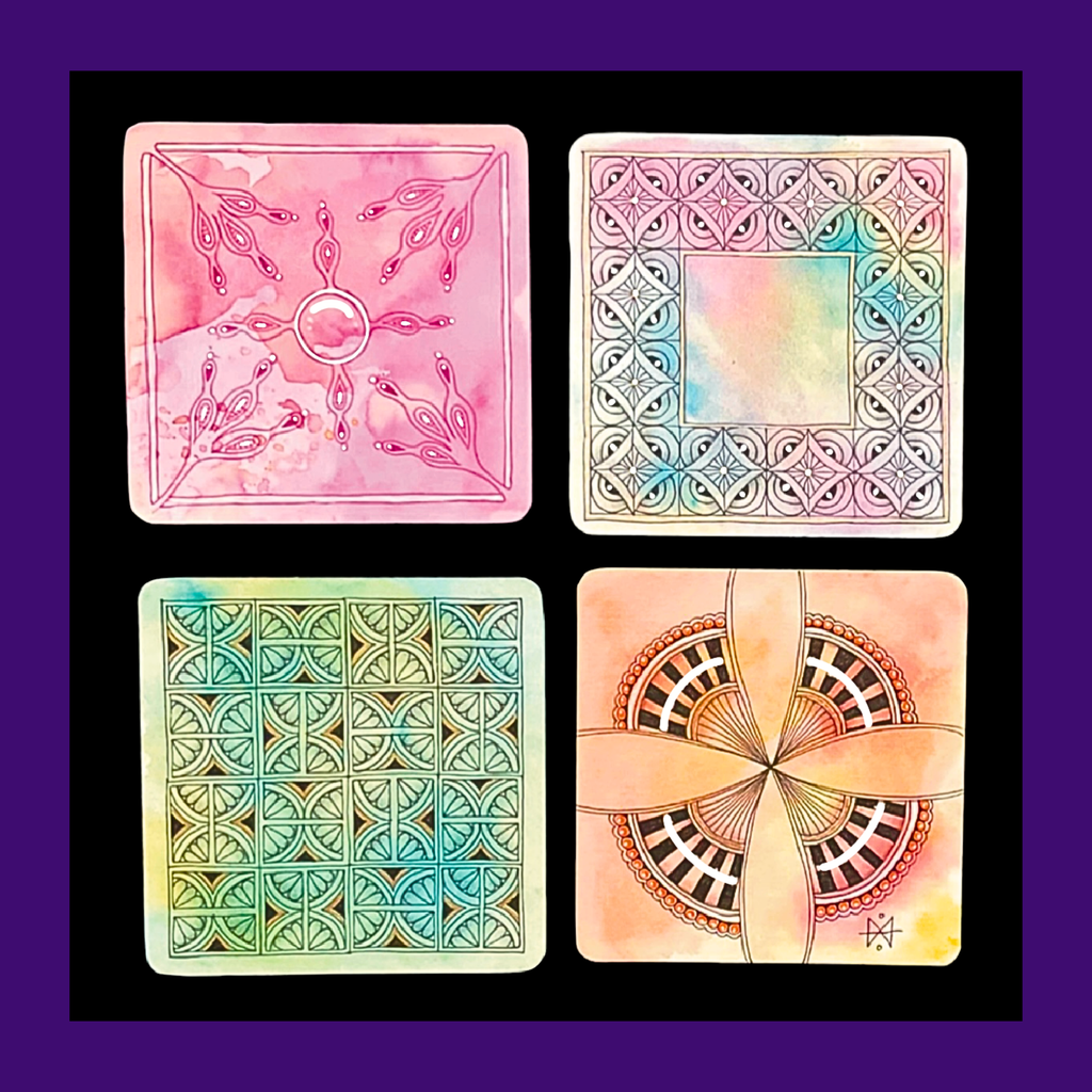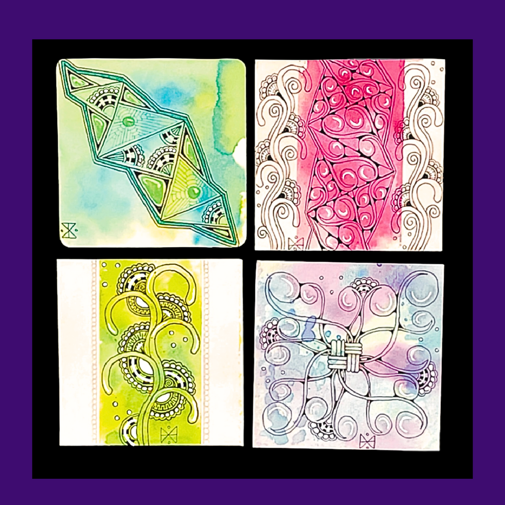 In this 2 hour workshop I will be showing you how to create a watercolour wash as a background for your Tiles. We will be using white Tiles and will create beautiful backgrounds to Tangle on. I will be showing you official Tangles, Strings, Borders and we will be using different coloured pens and pencils.